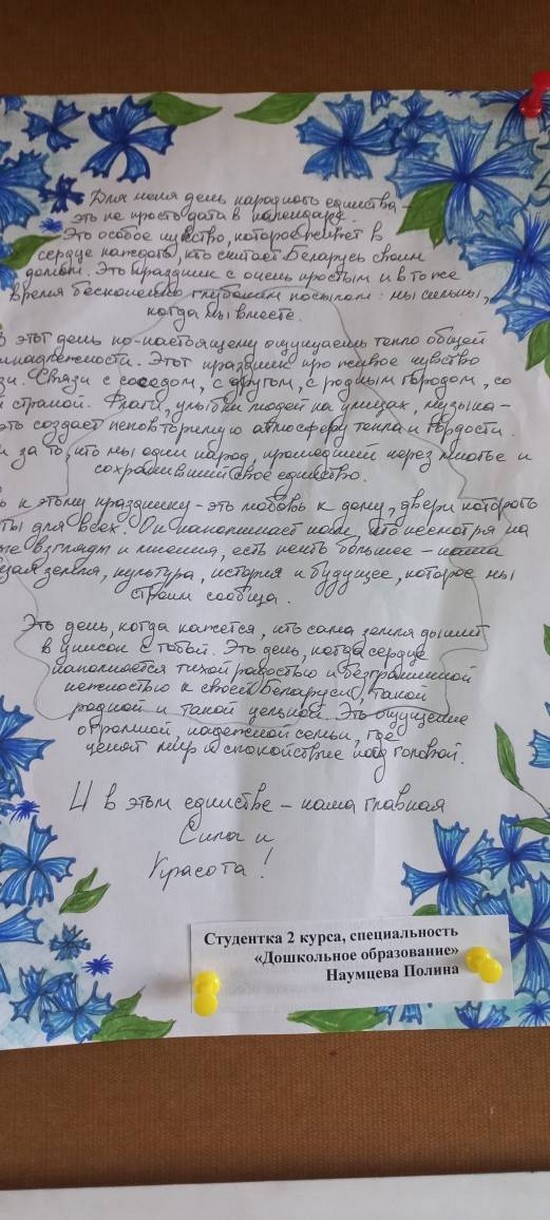 15 сентября 2025 года на факультете педагогики и психологии детства открылась выставка «День народного единства — творческий взгляд». Символический круг единства создали и запечатлели на фото студенты 1 курса специальности «Дошкольное образование». Фотоколлаж «Мы едины!» выполнила студентка 2 курса Веревка Карина. Плакаты, посвящённые празднику, нарисовали студент 1 курса Васильев Вадим и студентки 2 курса Макеева Екатерина и Костюкевич Карина. Философские эссе на тему значения праздника в жизни современного белорусского общества предложили студентки 2 курса Савушкина Ангелина и Наумцева Полина. Стихотворение «Мы едины» написала студентка 2 курса Климова Елизавета. Старший преподаватель Мурашко Елена Анатольевна принесла на выставку две своих работы — фотокартину «Не забывай!» и акварель «Прогулка по столице».