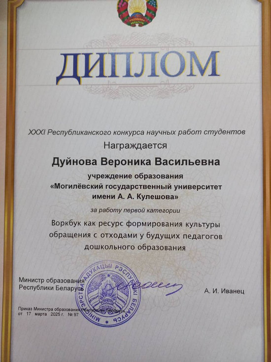 На факультете педагогики и психологии детства началось вручение дипломов победителям XXXI Республиканского конкурса научных работ студентов. От всей души поздравляем выпускников Дуйнову Веронику Васильевну и Москалеву Наталью Владимировну, получивших Диплом I степени (научный руководитель — старший преподаватель кафедры педагогики детства и семьи Т. А. Можарова)! Наши поздравления также выпускникам, получившим Диплом III степени: Пуськовой Виолетте Юрьевне (научный руководитель — кандидат педагогических наук, доцент, заведующий кафедрой педагогики детства и семьи О. О. Прокофьева), Невидановой Анастасии Дмитриевне (научный руководитель — кандидат педагогических наук, доцент Комарова И. А.), Шкуратовой Олесе Николаевне (научный руководитель — старший преподаватель кафедры психологии и коррекционной работы Е. А. Мурашко)!