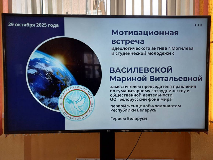 29 октября 2025 года студенты и преподаватели факультета педагогики и психологии детства приняли участие в мотивационной встрече, организованной Белорусским фондом мира, с первой женщиной-космонавтом Республики Беларусь, Героем Беларуси Мариной Витальевной Василевской. Эта встреча оставила неизгладимое впечатление в умах и душах людей, собравшихся в аудитории: мы узнали о деятельности Белорусского фонда мира, о впечатлениях Марины Витальевны от полета в Космос, роли Президента Республики Беларусь в освоении космических просторов и планах нашей страны по продолжению исследований в этой области. От всей души желаем Марине Витальевне постижения новых жизненных высот и реализации всех благотворительных проектов!