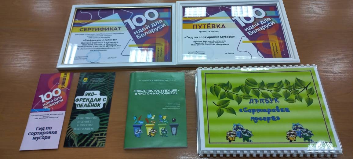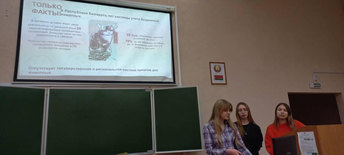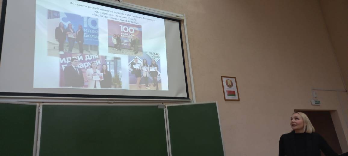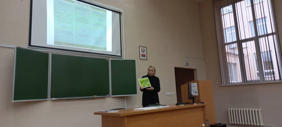 Студентки 3 курса специальности «Дошкольное образование» Ильенкова Виктория, Казакова Александра, Кравченко Вероника представили подготовленный ими конкурсный проект «Кошкин дом». Их руководитель, старший преподаватель кафедры педагогики детства и семьи Татьяна Александровна Можарова рассказала историю конкурса «100 идей для Беларуси» и продемонстрировала авторский кафедральный бредовый проект по раздельному сбору мусора, который стал победителем республиканского конкурса в минувшие годы.