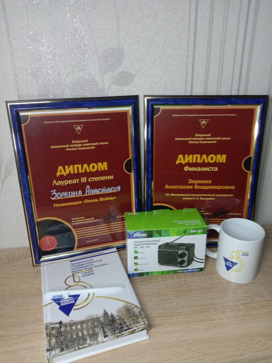 3–4 декабря 2025 года в актовом зале учреждения образования «Гродненский государственный университет имени Янки Купалы» царила торжественная атмосфера. На главной сцене университета проходил финал и гала-концерт открытого вокального конкурса советской песни «Голоса поколений», приуроченный к годовщине основания СССР и годовщине освобождения Беларуси от немецко-фашистских захватчиков. По итогам конкурса диплом финалиста и диплом Лауреата 3 степени в номинации «Песнь войны» получила студентка нашего факультета Анастасия Зоркина. Она исполнила песню «Плач матери» (автор музыки и слов Евгения Колпакова).