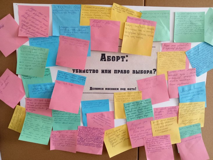 После просмотра перед студентами был поставлен непростой вопрос — «Аборт: убийство или право выбора?». На разноцветных стикерах студенты выразили свою позицию в этой сложной дискуссии, отражая всю палитру взглядов — от категорического осуждения до глубокого понимания личных обстоятельств, вынуждающих женщину к такому шагу.