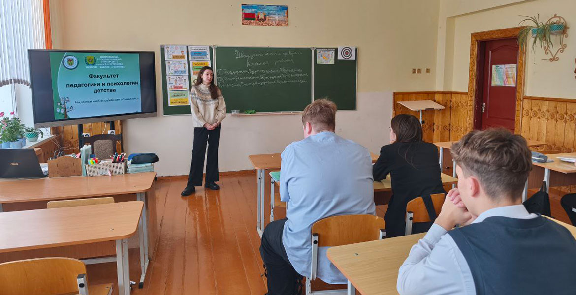 Анастасия Наезжая в ГУО «Кадинская средняя школа» провела профориентационное занятие с учащимися 10 класса. Старшеклассники познакомились с основными специальностями МГУ имени А. А. Кулешова, правилами приёма, сроками подачи документов, проходными баллами прошлых лет и возможностями целевого обучения. Анастасия не только рассказала о факультетах, но и поделилась личным опытом поступления, яркими студенческими событиями и перспективами, которые открывает университет.