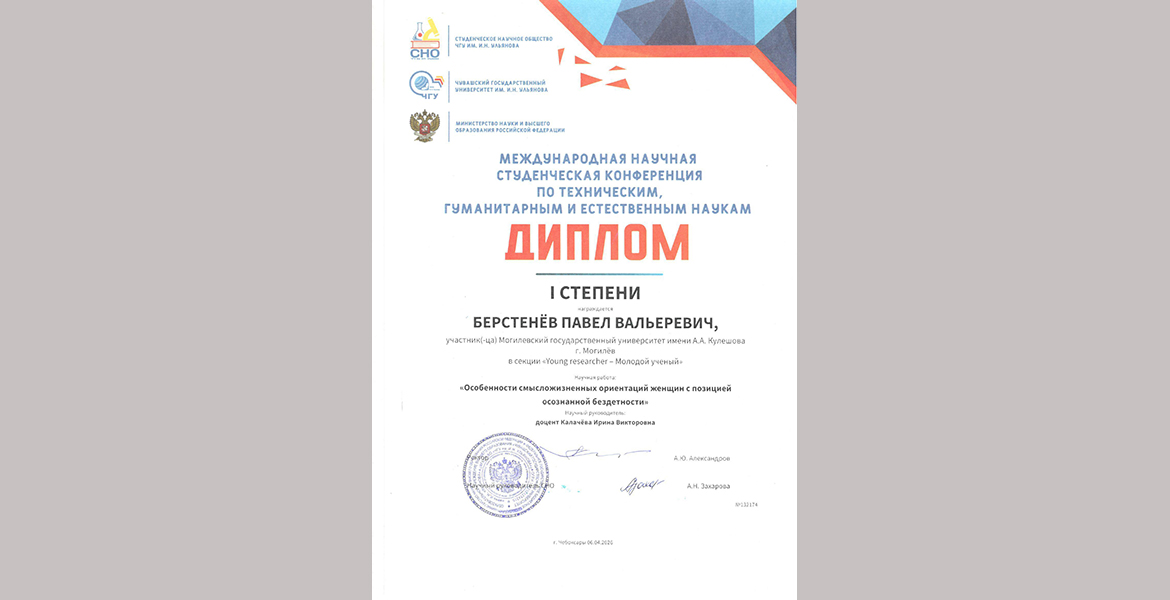 По итогам участия в конференции научная работа студента 3 курса, специальность «Психология» Павла Берстенёва «Особенности смысложизненных ориентаций женщин с позицией осознанной бездетности» получила диплом I степени, а работа студентки 4 курса, специальность «Психология» Елизаветы Алдановой «Социально-психологические детерминанты самоотношения девушек-моделей» удостоена диплома II степени в секции «Young researcher — Молодой ученый». Работы выполнены под научным руководством кандидата психологических наук, доцента И. В. Калачевой.