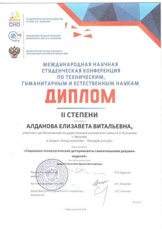Студенты факультета педагогики и психологии детства, обучающиеся по специальности «Психология», приняли участие в Международной научной студенческой конференции по техническим, гуманитарным и естественным наукам, которая была проведена 6 апреля 2026 года на базе Чувашского государственного университета им. И. Н. Ульянова (РФ).