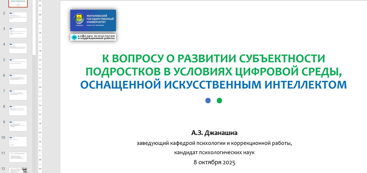 Могилевский университет представил заведующий кафедрой психологии и коррекционной работы, кандидат психологических наук А. З. Джанашиа, выступив с приветственным словом и докладом «К вопросу о развитии субъектности подростков в условиях цифровой среды, оснащенной искусственным интеллектом» на пленарном заседании конференции.